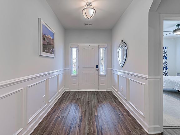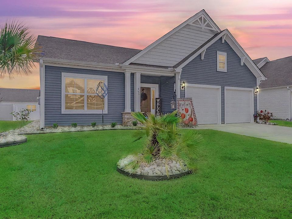 Better Than New! This lovely craftsman-style home features three bedrooms, two full baths and a 2-car garage. Located in Evans Park, a small community in the International Club, a golf course community in Murrells Inlet. Less than 4 years old, this single level home in this natural gas community is in mint condition. Attention to detail and pride of ownership are immediately apparent. The tone is set from the moment you drive up to this home with its attractive blue siding with white trim and masonry accent, manicured lawn, palm trees and covered front entry. This home features arched entryways, luxury vinyl plank flooring in living areas, ceramic tile in baths and neutral carpet that adds warmth to the bedrooms. Open floor plan with 12' ceilings in the family room and kitchen and 10 ft ceilings in the primary bedroom make this home feel open and airy while smooth ceilings, crown molding and the neutral colors of the walls will make you feel right at home! Natural gas heat, Rinnai on demand hot water heater, outdoor fireplace and gas range Enter the home into a spacious foyer with chair rail, shadow box molding, hall tree, large closet and arched entry open to the family room and kitchen. Spacious family room with vaulted ceiling with fan, recessed lights, window and slider to the enclosed porch. The family room opens to the chef’s kitchen, perfect for entertaining or enjoying meals. The kitchen features stone gray shaker style cabinets with white quartz countertops, gas range, tiled backsplash, stainless steel appliances including a French door refrigerator, staggered height cabinets with crown molding, and a large island with newer sink and faucet and pendant lights. Bright and cheery breakfast nook with windows bringing in lots of natural light and door to the enclosed porch. Split bedroom plan with the primary bedroom suite located in the rear of the home. Features include a vaulted ceiling with fan, walk-in closet with custom cabinets and a primary bath with vanity with marble top, two sinks, tiled 5’ walk-in shower with seat and transom window, linen closet and tile floor. Friends and family who are visiting will enjoy the privacy of the two good-sized guest bedrooms at the front of the home and full bathroom with tub/shower and tile floor. A Slider from the family room leads to the enclosed porch with E-Z Breeze vinyl windows, a corner stone natural gas outdoor fireplace, ceiling fan, LVP flooring and windows overlooking the patio and fenced backyard. This 3-season room will be the ideal place to read an enjoyable book, watch your favorite TV show or enjoy the fireplace on a chilly Carolina evening. Or better yet, head out to the oversized patio. What a great spot to start your day with your favorite morning beverage or relax at the end of the day. The owners have made this area a private oasis with fire table and even a detached 10x12 storage shed for the lawn mower, tools and all those extra items. Entertaining comes naturally here! What a great spot for grilling, entertaining and building memories with family and friends. Separate Laundry room with custom shelving. Attached 2 car garage. Since the owner’s purchased the home less than four years ago, they enclosed the covered porch and added E-Z Breeze windows, LVP flooring and ceiling fan, expanded the patio and fenced the backyard, added a storage shed and fire table. Other features of the home include an irrigation system, blinds throughout, window casing around all windows in the house and termite protection. HOA fee includes basic cable TV and trash pickup. Excellent location, just minutes to golf courses, food stores including Publix and Lowe’s Foods, restaurants, Brookgreen Gardens, shopping, hospital, MarshWalk, Huntington Beach State Park and the beautiful blue Atlantic. Truly a lovely home you will want to see! Measurements and square footage are approximate and not guaranteed. Buyer is responsible for verification.