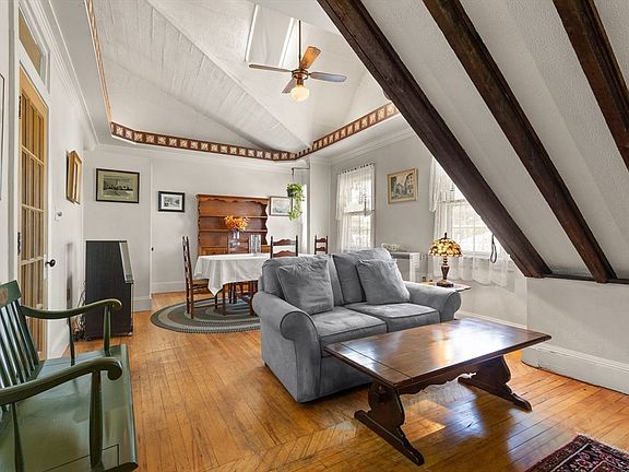 Welcome to this one-of-a-kind condo set in a stately Victorian building full of character and charm. The property showcases timeless architectural details with its distinctive rooflines, decorative trim, and welcoming front porch that hint at its rich history. Step inside to find a home filled with warmth and personality, featuring cathedral ceilings with exposed beams, hardwood floors, and skylights that bring in abundant natural light. The open-concept living and dining area offers both comfort and charm, perfect for cozy nights or entertaining guests. The bedroom offers a cozy retreat with angled ceilings and natural light, creating a unique space with plenty of character. The bathroom is equally distinctive, featuring a clawfoot tub with gold finish, a walk-in shower, and rustic wood vanity—all adding to the home’s timeless appeal. An added bonus: this unit comes with two deeded parking spaces, including one garage space—a rare find that adds both convenience
