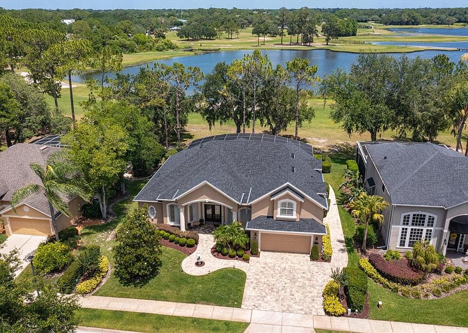 Stunning WATER and GOLF-FRONT Custom Home with 4 bedrooms plus office, 3 full baths and golf cart garage in Timacuan Golf and Country Club community. Sparkling salt water, heated pool and spa surrounded by 60 x 25 screen enclosure featuring TRAVERTINE PATIO plus cozy electric FIREPLACE on the covered porch. PICTURE PERFECT! Open family room features custom built-in entertainment center with lighting and triple pocket sliding door to the pool. Chef size gourmet kitchen features GRANITE COUNTERS, travertine backsplash, custom cabinets with center island, walk in pantry, STAINLESS STEEL appliances and pendant lighting. Great WET BAR just off the kitchen and nook with wine refrigerator plus large granite bar. Luxurious downstairs primary suite features wood floors, bay window and spacious custom walk in closet! Downstairs guest/inlaw suite is perfect for guests. Two bedrooms upstairs feature wood floors and Jack and Jill bathroom. Large laundry room with cabinets for extra storage just off the kitchen. Triple crown molding, PLANTATION SHUTTERS, custom trim, surround sound speakers, Engineered wood floors and so much more! Fabulous custom upgrades throughout this ready to move in Lake Mary home!