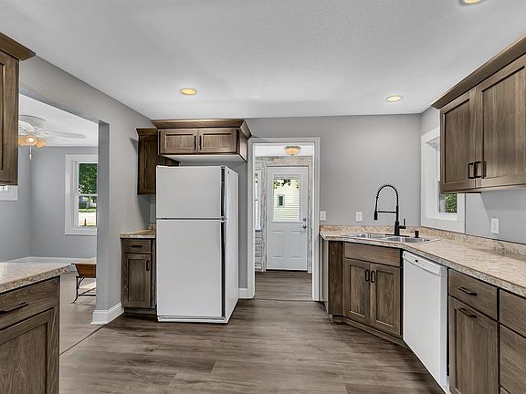 Newly remodeled! Very nicely done! New kitchen cabinets and countertops! Main floor laundry is shared with a 3/4 bath. Roof was replaced in 2021. New air conditioner last year. New interior paint. New gas fireplace. Vinyl plank flooring in most of the home. Convenient side entrance/ mud room just off the kitchen! The home has steel siding and vinyl windows! Easy keeper! Can accommodate a quick closing!