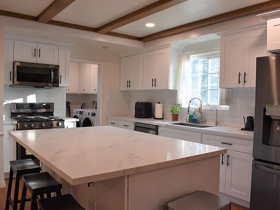 Modern upgrades to kitchen. Quartz counter tops and large kitchen island. Modern appliances.