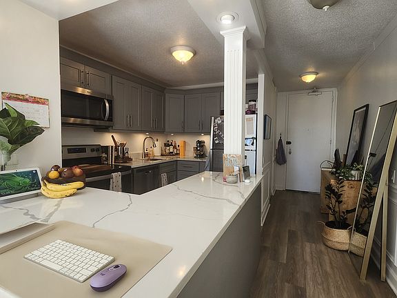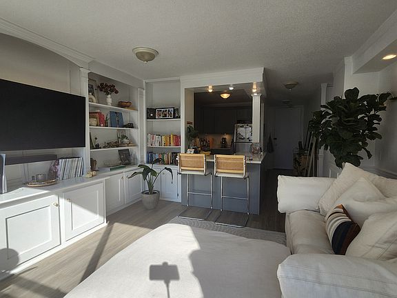 This unit features: Wood flooring flowing throughout the entire space. A bright living room with custom built-in shelves and drawers, complete with soffit lighting. A kitchen that boasts sleek quartz countertops, stainless steel appliances, sophisticated grey-tone cabinetry, and functional under-cabinet lighting. A refreshed bathroom with updated floor tiling, a large vanity offering ample counter space, and a substantial mirror framed with a clean white trim design. A spacious bedroom featuring a wide closet to meet all your storage needs.