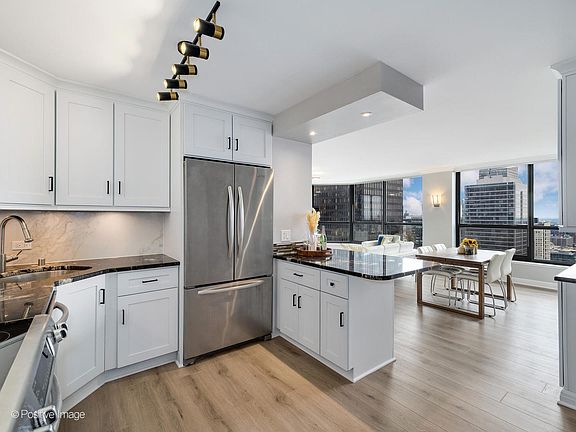 Presenting this stunning newly rehabbed penthouse two bedroom two bathroom condo at River Plaza. Stunning panoramic views of Chicago's skyline, river and Lake Michigan from the 51st floor. Located in the heart of downtown Chicago. This spacious unit is newly renovated, there's an open kitchen with white shaker cabinets, led under cabinet lights, granite counters with breakfast bar, full marble backsplash, high-end stainless steel appliances. Featuring rare in-unit washer/dryer. Kitchen opens to the living room with a wet bar & additional cabinets. The dining area has a credenza with even more cabinetry. Wrap around windows in the entire living space provide bright natural light, coupled with bird's eye views from all angles. The master suite has a renovated bathroom with walk-in shower, finished with contemporary tiles. The 2nd bedroom is located with direct access to the renovated guest bathroom with walk-in shower. Both bedrooms have overhead recessed lighting and professionally organized closets with automated lights. There are new HVAC systems in the unit, also the building has undergone a major HVAC system upgrade. Throughout the unit there are new wide-plank light wood color flooring, designer lighting, new closets. Assessments include heat, A/C, water, cable, internet (everything except electricity). River Plaza is a full amenity building that offers 24 hour door staff, on-site management & maintenance, evening security, 24 hour fitness room, year round indoor pool & hot tub, sun deck, package room, party room and on-site laundry with app feature. The location is ideal, in the middle of all that the wonderful city of Chicago has to offer for entertainment, dining, shopping, nightlife, riverfront, city parks and more. Amazing unit in a wonderful building with a perfect location.