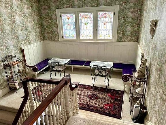 From the stately front piazza, enter a grand foyer flanked by formal living and dining rooms, each adorned with original woodwork, stained glass, and three working fireplaces. Functioning pocket doors and intricate architectural details speak to the craftsmanship of a bygone era.