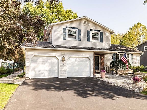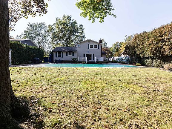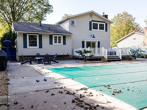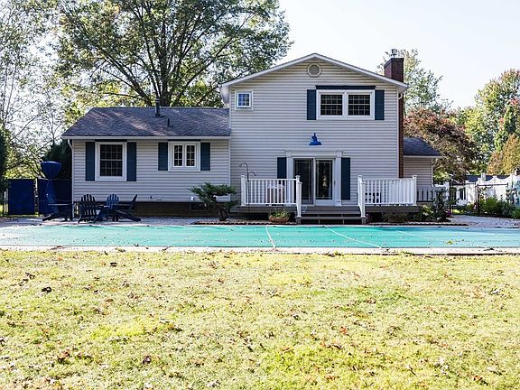 Welcoming, spacious ceramic tiled entry foyer offers a closet and a remodeled half bath with pocket door. The remodeled kitchen boasts Maple cabinets, Quartz counters, Parquet floors, breakfast bar and even a wine cooler! The formal living room is light-filled with a large picture window, hardwood floors, accent wall, crown molding, hardwood floors and open staircases. The formal dining room has hardwood floors, crown moldings and ample room for holiday gatherings. The first floor family room features a brick, gas fireplace, crown molding, sliders to composite deck and is conveniently open to the kitchen. Upstairs there are three spacious bedrooms, graced with hardwood floors and mirrored closet doors. A stunning remodeled bathroom including a Corian topped vanity with undermount sink. The basement level has a fairly new double shower and ample room for additional living space if needed. Outside a beautiful backyard boasts an inground pool, new shed to house the pool equipment, patio, brick paver walkway, composite deck and a fully fenced, landscaped yard. Some of the special features of this home are the whole house generator, Rinnai tankless water heater & composite deck.