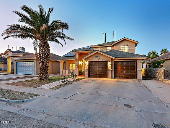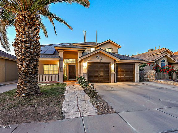 Welcome to Socorro's hottest listing! A spacious, family-friendly home with paid-off solar panels that keep utility bills incredibly low! This two-story home offers five bedrooms, a loft, and multiple living areas, giving everyone room to relax. The formal living room and cozy family room with a fireplace flow into a kitchen with a breakfast bar and dining area — perfect for hosting. The primary suite downstairs is large enough for a sitting area or an office set up, while upstairs features four roomy bedrooms and a loft. The backyard is finished and has both grass and concrete, ideal for pets and children to play. With refrigerated A/C and paid off solar panels, enjoy comfort and major savings — recent gas and electric bills averaged around $75 total.