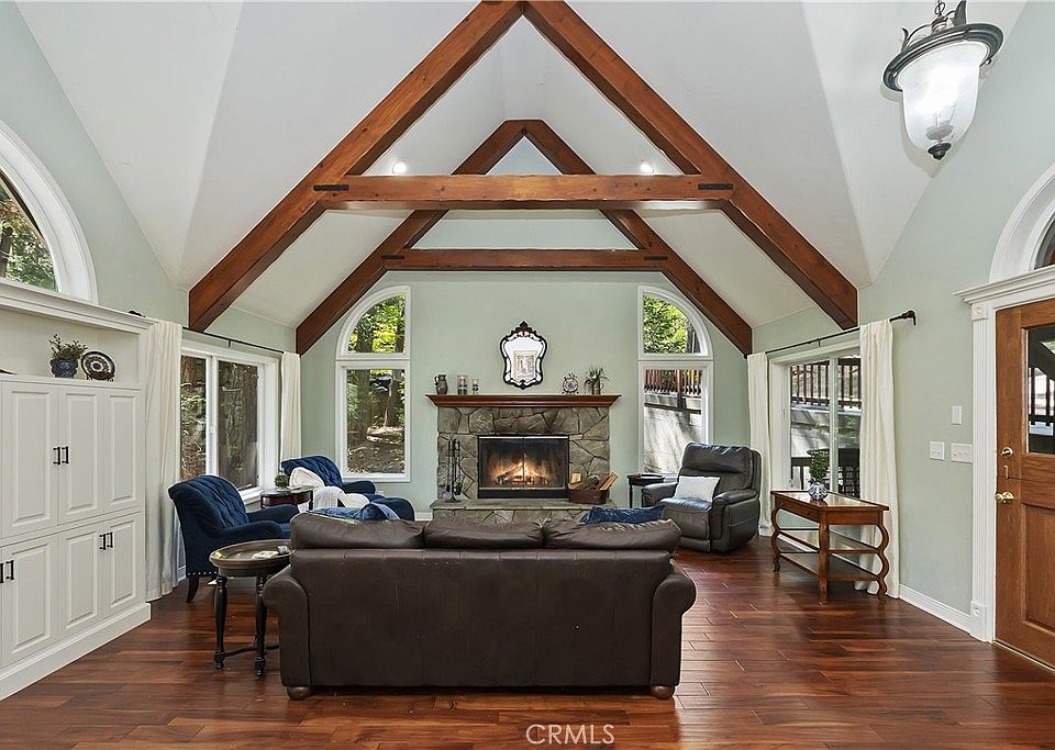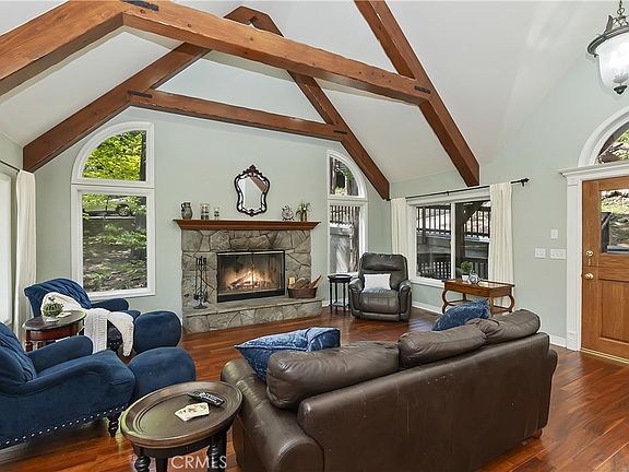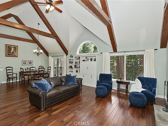 Surrounded by towering trees and located just minutes from the Lake Arrowhead Village, this inviting 2-bedroom cabin captures the essence of rustic mountain living with a warm, lodge-style feel. Vaulted ceilings, rich hardwood floors, and natural wood accents create a cozy yet open ambiance, ideal for weekend escapes or year-round enjoyment.