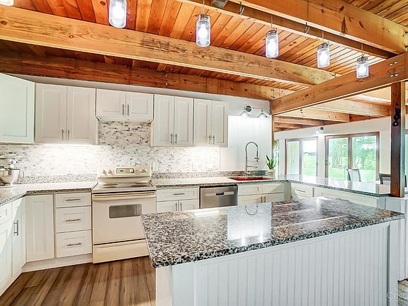 Welcome to an entertainer's dream home! This open contemporary plan pairs casual elegance w/ practical living, skylights and floor to ceiling windows invite the natural light & draw the eye to the private yard fringed by woods, reclaimed from 2 decades of overgrowth. Lovingly converted to 4 bedrooms with 2600+ of expanded square footage, along with 2 full baths, a bonus 3rd vanity, and huge closets big enough to be offices ... Options to enjoy the living here abound inside and out. The rear deck has also been expanded to full width, opens inside to expansive solid surface kitchen with island, and airy dining room and family room under exposed beams. Situated on a level 2.64 ac lot on a dead end road with a flourishing garden, firepit, swings and more - there's so much to appreciate and enjoy. Showings & offers will be entertained through Tuesday June 18 at 8pm. Owners reserve the right to take an acceptable offer prior to this timeline at their own discretion.