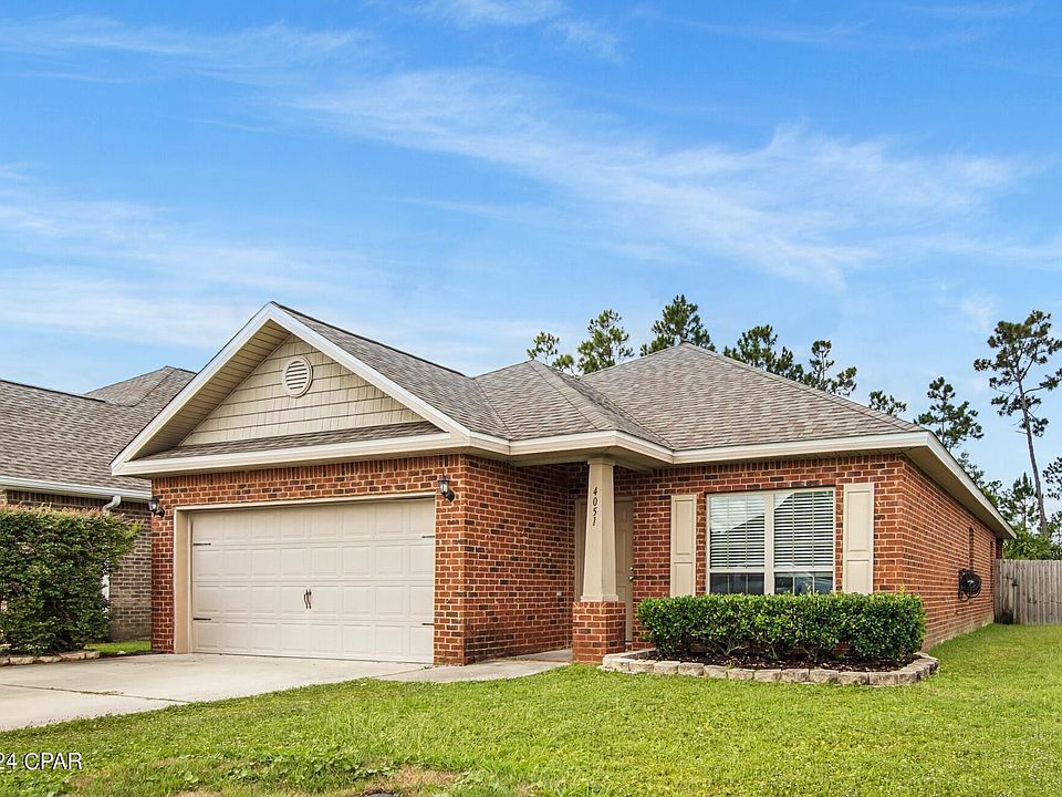 This lovely, all brick home backs up to the environmental corridor (NOT Transmitter Rd) and is in a cul-de-sac, features 3 bedrooms, 2 baths, and office,open kitchen, dining and great room. Kitchen features upgraded cabinets and granite countertops. Large bedrooms, split plan, master bath features a soaking tub and all tile shower. Tile in the front entryway, kitchen, dining area, bathroom and laundry. LVP in living room and Bedrooms , Office can be used as 4th bedroom but does NOT have a closet and was being used as a nursery, Yard is landscaped and has sprinkler system, Back yard has covered back patio and privacy fence, perfect for a place for kids to play. All sizes approximate and taken from public records, buyer to verify any details buyer deems important.