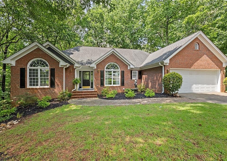 Supremely private ranch home nestled in the woods, located in a great neighborhood on a quiet cul-de-sac. This home is move-in ready, low maintenance 3-sided brick over a finished basement in a great location - just moments from I985 and Gainesville amenities. Large, wooded lot shades the home and adds to the seclusion. Desired split-bedroom floorplan with hardwood floors, separate dining room, primary suite wing, and 2 additional BRs on the main level. Enjoy a huge great room with vaulted ceiling, cozy gas fireplace, and access to the private back deck. The large eat-in kitchen features upgraded granite countertops, real wood cabinetry, gas stovetop, stainless appliances, breakfast space, and a large laundry room. You will love the updated primary suite bathroom with granite countertop, big tiled shower, jetted tub, and nicely appointed walk-in closet. Host guests with ease from the sprawling terrace level, complete with a full bathroom, rec space with second wood-burning fireplace, great office room or more sleeping space, additional storage, and walk-out patio.