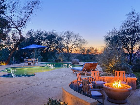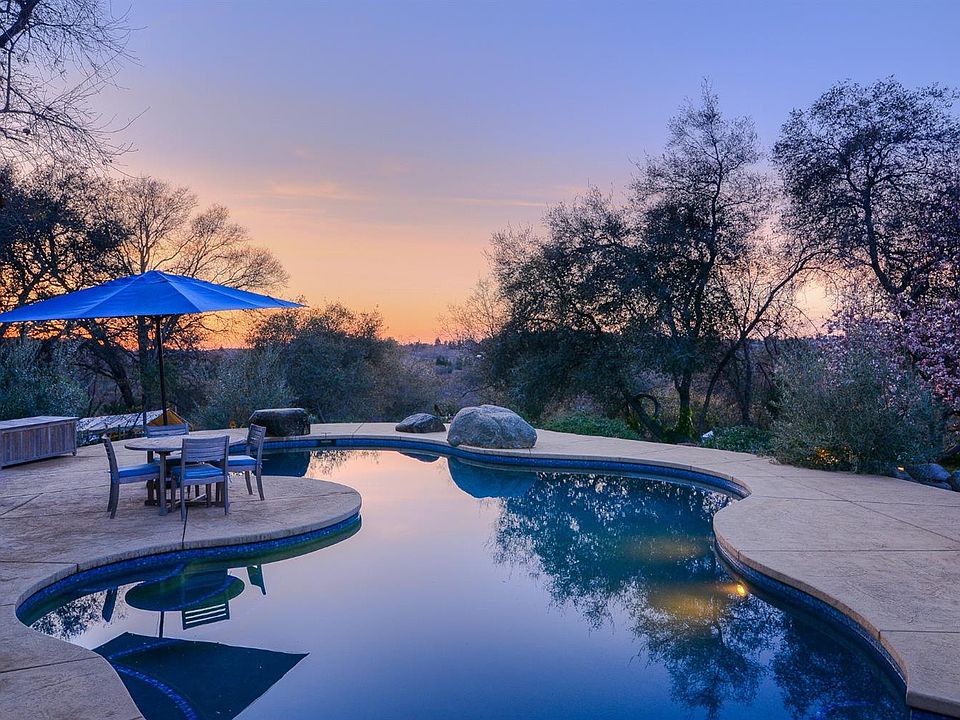 Hilltop country retreat on 3.3 secluded acres*Enjoy the sunset views from the newly remodeled pool and expansive stamped concrete decking*Updated interior features dramatic great room with wall of windows, hardwood floors, updated fireplace, formal dining*Kitchen with granite counters, cherry cabinets, double ovens, built-in fridge*Master suite looks out to waterfall & koi pond*Recently remodeled master bath with double sinks, shower stall, free-standing tub, custom walk-in closet*Separate family room or remote bedroom with updated accessible bath with walk-in shower*The only upstairs room in main house is 4th bed/office/loft*Basement wine cellar*Detached 3 car garage*Granny flat over garage (approx 600 sq ft with kitchen, living room, bedroom & 1.5 baths*Solar electricity at main house (owned*Horse pasture, chicken coop, hay barn, fruit trees*So peaceful & quiet, truly a magical setting*Easy access to Folsom Lake & lake trails*