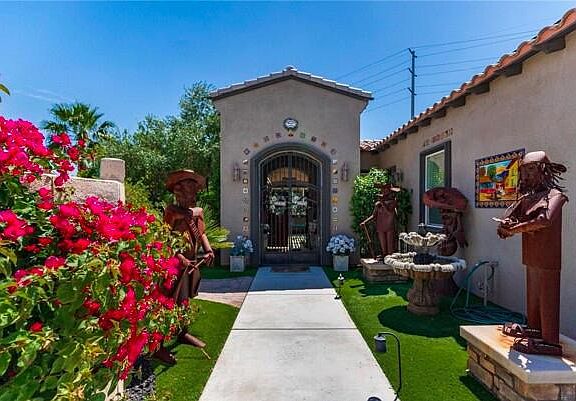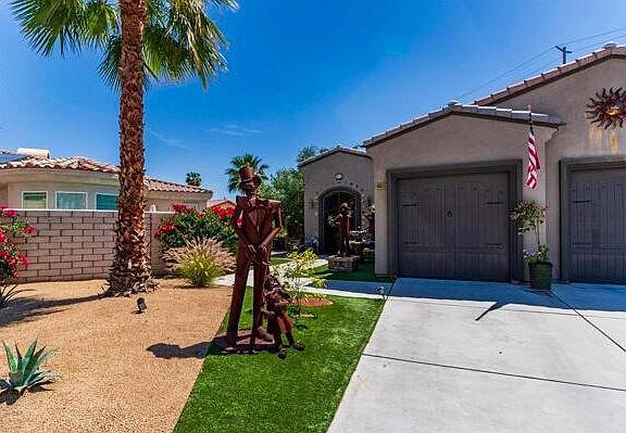 Resort style living in this exquisite Spanish style oasis, ideally situated on the most desirable lot at the end of the culdesac. As you step inside, the timeless elegance of Spanish tile flooring welcomes you, leading you through warm and inviting spaces. Entertain with ease at the wet bar, adorned with stunning granite countertops. The spacious kitchen, featuring a walk-in pantry and captivating views of the backyard, is perfect for culinary enthusiasts. Two bedrooms share a beautifully designed Jack and Jill bathroom, while the laundry room conveniently connects to the expansive threecar garage. The master suite serves as a private retreat, offering breathtaking views and a luxurious ensuite bathroom, complete with two walkin closets and upgraded amenities like a self flushing toilet and a bidet. A cozy fireplace enhances the living area's ambiance, and a versatile office/den space can easily transform into an additional bedroom. Step outside to your sprawling backyard, featuring a charming gazebo for family gatherings and a tranquil courtyard with a soothing water fountain. Dive into the generous pool or rinse off with the outdoor shower. With eight fruit trees including plum, fig, and grapefruit you can enjoy fresh produce year round. This property also includes a separate Casita, ideal for guests or rental opportunities. Centrally located near El Paseo's shopping, world class golf courses and entertainment options this home embodies luxury and convenience. PricedToSell