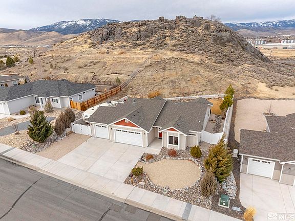 Welcome to this meticulously maintained, better-than-new single-story home, built in 2018, situated on a generous .72-acre lot with breathtaking views and ample RV parking. Located in a highly desirable neighborhood, this home backs to open space, offering unparalleled privacy and a serene backdrop. The thoughtfully designed open floor plan maximizes natural light and takes full advantage of the stunning views., Inside, you’ll find upgrades throughout, granite countertops, custom copper sink, and stainless steel appliances. The spacious master suite is a true retreat, featuring a luxurious walk-in shower, a separate soaking tub. Outside, the fully landscaped yard is complete with automatic sprinklers, a drip system for six raised planter beds, and an assortment of fruit trees. Pine trees and a beautifully designed back patio, with spa tub, add to the charm of this tranquil outdoor space. For those with hobbies or looking for extra storage, the 6x10’ workshop is fully equipped with electricity. The three-car garage features built-in shelving and work benches that remain with the home, perfect for organizing tools or taking on DIY projects. Located near city walking, biking, and hiking trails, and the Carson River, this home offers the perfect blend of comfort, convenience, and natural beauty. Don’t miss out on this rare opportunity to own a home in one of the area’s most sought-after neighborhoods.