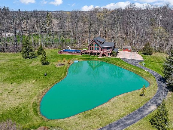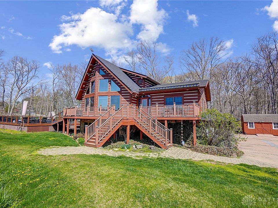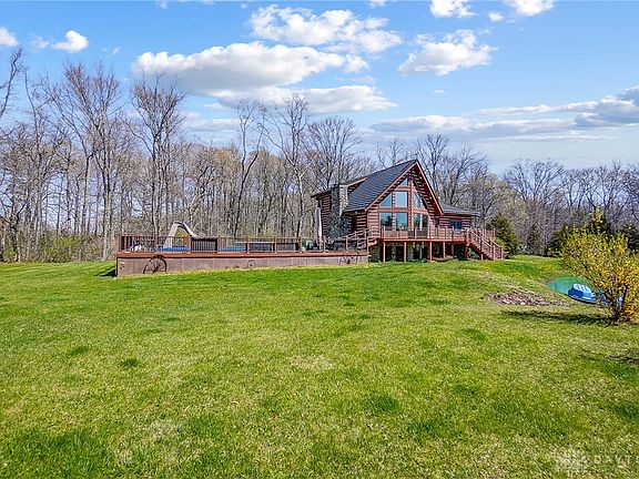 One of a kind! Amish custom-built log home, one owner with 4125 sq.ft. Located on 4.5 acres including large pond stocked with fish, 18x33 above ground pool-4ft. deep, inviting composite deck surrounding pool measures 34x51. 1 acre of invisible fencing surrounds the pool and pond. Hot tub stays also. Nice front of the house composite deck with retractable awning recently redone. Massive great room with pellet stove, vaulted ceilings and A frame like wall of windows. Dining room has Stone wood burning fireplace. Kitchen offers bar area, and all stainless-steel appliances stay. Rear of house gives more room with a 3 story sunroom. Main floor sunroom leads to rear deck with Sunsetter awning. Flooring is mostly vinyl planking and ceramic tile. Tongue engrooved wood in interior with 6 panel wood doors and many rooms with beamed ceilings. Two spacious bedrooms on the main floor. Loft on second level leads to huge primary bedroom with stoned surround jacuzzi with jets, glass block and tiled walk-in shower, dual sinks, bidet and walk in closet. Full finished walk out basement leads to patio, features full bathroom with walk in shower, possible 4th bedroom/office, rec room with stoned fireplace. Also, an extra area plumbed for future bar. Additional notable items include a metal roof just 2 years old with transferable warranty, newer leaf guards, Rhino shield painted on exterior with transferable warranty. Anderson double pane and argon windows, Two 200-amp breaker boxes. Rear woods have walking trails and wildlife visits occasionally. Truly a stunning home!