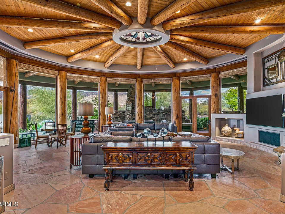 Outdoor living is unparalleled, with a shaded patio and gas fireplace, stunning views, a pool, spa, and built-in BBQ. A generous three-car garage completes the home, all just moments from the Desert Mountain gate and Sonoran Club.