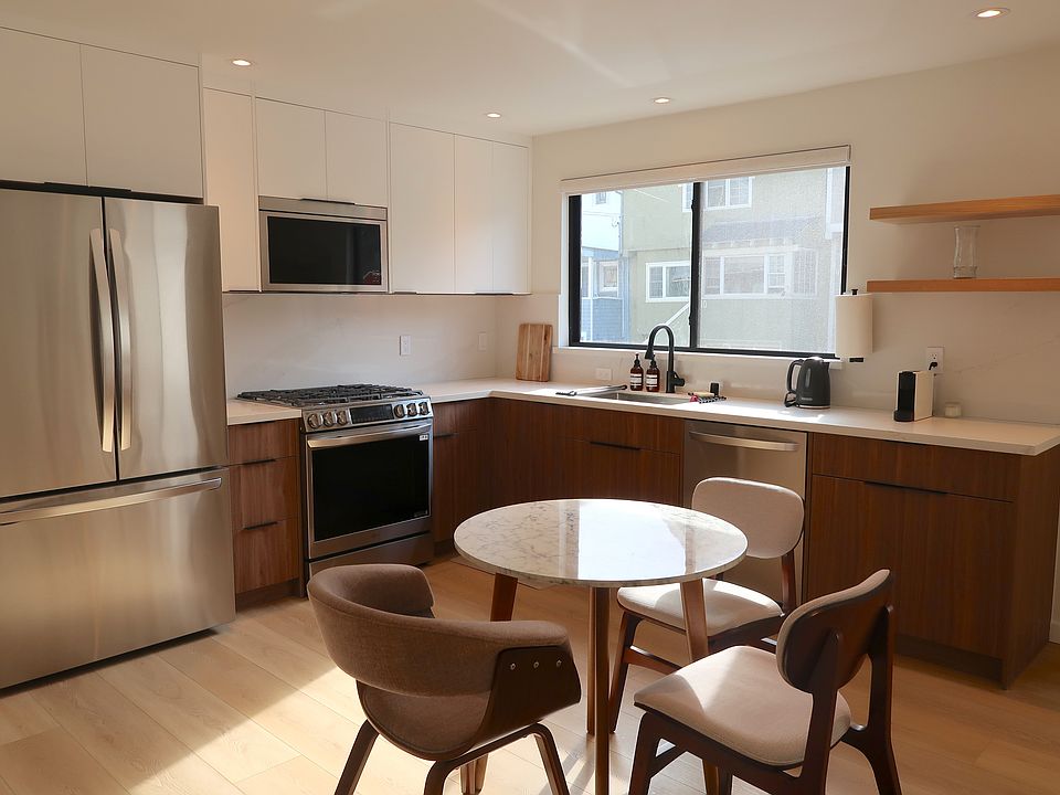 Open layoutNatural lightNewly renovated interiorNew high end appliancesAmple storageIn-unit laundryWarm ambiance