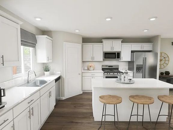 This two-story, brand new open-style home is perfect for a large family. This home has five bedrooms, two full bathrooms, a powder room, family room and living room within approximately 2,108 square feet of living space. The kitchen features shaker-style cabinetry with satin nickel pulls, beautiful quartz countertops, a walk-in pantry, a center island with snack bar, and Whirlpool stainless-steel appliances including a range, microwave , dishwasher and refrigerator . The adjoining great room and dining room make this area the perfect spot for entertaining guests. On the second floor, you will find the main suite with adjoining bathroom with dual vanity sinks and large walk-in closet, four bedrooms, a full bathroom with dual vanity sinks, laundry room and an extra-large storage closet.