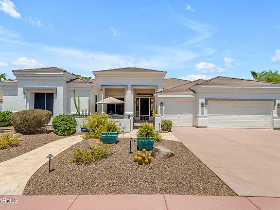 Disregard days on the market,,,Buyer's contingency expired Discover this exquisite custom home nestled within the gated community of Country Club Estates at Red Mountain Ranch. Perfectly positioned on the 17th green, this residence offers stunning views of the signature golf course and breathtaking mountain vistas. Spanning over 3,100 square feet, this single-story home boasts soaring ceilings and a thoughtfully designed layout, featuring 3 bedrooms, a custom office with built-in cabinetry, and 3 full bathrooms. Step into the inviting great room, where formal dining and expansive windows create a seamless connection to the backyard oasis. The chef's kitchen is a culinary masterpiece, complete with custom cabinetry, a large island with seating, a Viking gas stove, Thermador double ovens, a built-in microwave and a KitchenAid wine fridge in the bar dedicated area. Adjacent to the kitchen, the cozy family room with a fireplace provides excellent views and a warm ambiance. The luxurious primary bedroom offers an oversized retreat with a large walk-in closet, sitting areas, and direct access to the backyard. The ensuite bathroom is a spa-like haven, featuring a massive marble shower, dual sinks, a private toilet room, custom cabinetry, and ample storage. The additional bedrooms are thoughtfully separated, each with walk-in closets and access to a beautifully appointed full bathroom.The outdoor space is a true sanctuary, featuring travertine pavers, an extended covered patio, a sparkling heated pool renovated in 2020, a gas firepit, and a built-in BBQ with an eat-up bar. This meticulously maintained property has it all! Enjoy the amenities of the Red Mountain Country Club, including a golf course, clubhouse with a restaurant, workout facilities, a pool, tennis, and pickleball courts. With so much to offer, this home is a rare find. Don't miss your chance to own this exceptional property!
