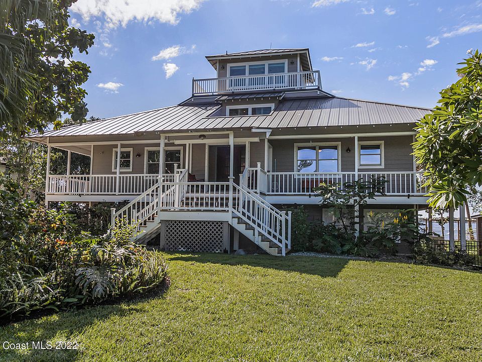 Key West Style Home, 148' Frontage on the Indian River with pool and dock. The home has had many recent updates. It is 6 Bedrooms and 4.5 Baths, and 4,517 sqft under air. The main portion is 4 beds and 3.5 baths. The lower floor is 2 Beds and 1 bath. 5 of the bedrooms look out to gorgeous views of the Indian River, and the spectacular sunsets. Walk in the main floor to an open concept that feature the water views. The kitchen has high end appliances, stone countertops & plenty of storage. A dining room, half bath, and laundry/utility room too. The primary suite is located on the main floor, spacious with plenty of closets and storage. Two more bedrooms & baths on the third floor, and up to the crow's nest with stunning views of the Indian River. The first floor is a separate 2 bedroom and 1 bath living area with full kitchen, laundry, and a new game room. It is great for extended family or guests. The grounds have been recently updated with an oversized paver driveway & extra parking. There is an oversized two car garage with additional storage, and a new storage shed for all the other toys. The rear section is fenced. Beautiful Pool with paver deck and built-in umbrellas. The dock was rebuilt recently and includes covered boat lift. The metal roof was replaced in 2020. Landscape lighting was recently installed around the property. It is a magnificent property and ready for the next owner to fully enjoy.