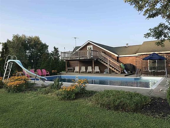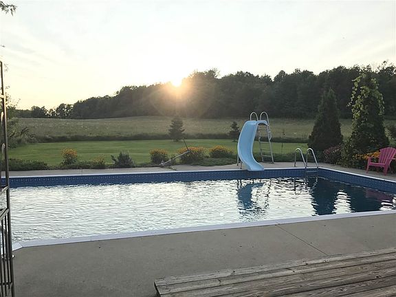 3 BR,2BA Custom built log home w/ 2 stall att garage on 1 A.landscaped w/Paved drive,storage building,inground pool/patio area & huge covered porch perfect for relaxing on.Craftsmanship throughout w/ stone and natural wood.cozy LR w/pine walls and ceilings that lead to the kitchen and dining area both with hardwood floors,tongue&groove ceiling,custom cabinets & fully applianced.sliding glass doors to patio & pool area.Great room w/cathedral pine ceilings,floor to ceiling unique stone fireplace w/wood insert & plank hdwd fls. landing area w/log stairs to master BR & deck.beauiful perrienals