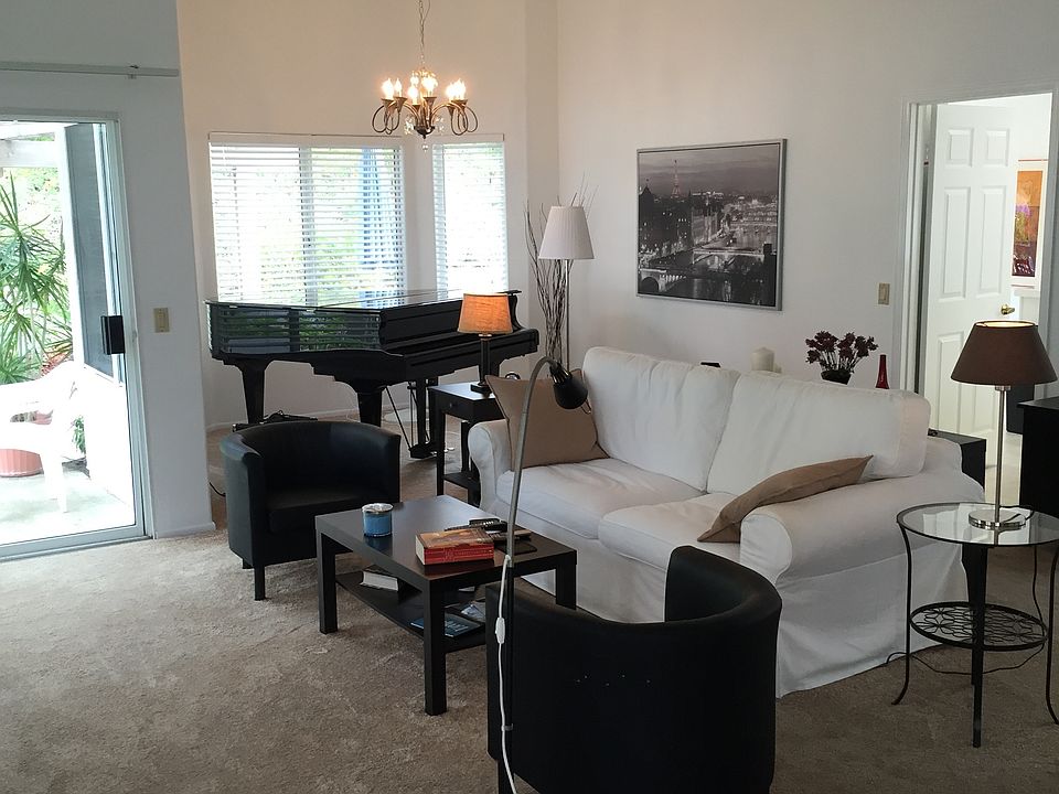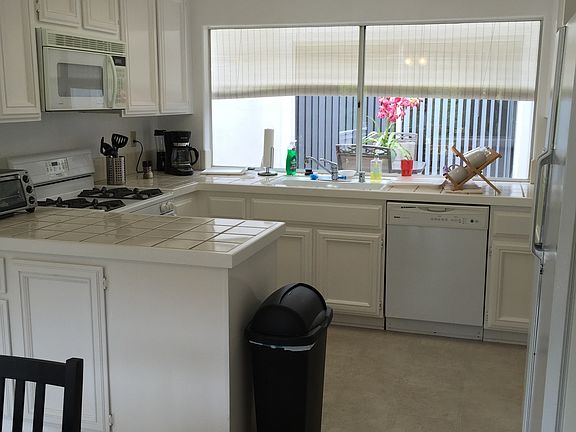 This is a spacious and gracious two bedroom, two bath single-story with vaulted ceiling's and lots of natural light. This home offers 1800 ft. of living area and with the open floor plan it even feels larger. As you enter there the home there is an oversized great room with an indoor atrium surrounded by the living area which is great for outdoor reading, relaxation or dining. The kitchen is light and bright and is large enough for a table with has a sliding glass door off the kitchen to your private lush patio. There are ceiling fans in the living room, kitchen and master bedroom areas with faux wood blinds on the windows. The home has an indoor laundry with a full-size washer and dryer with direct access to your two car garage.