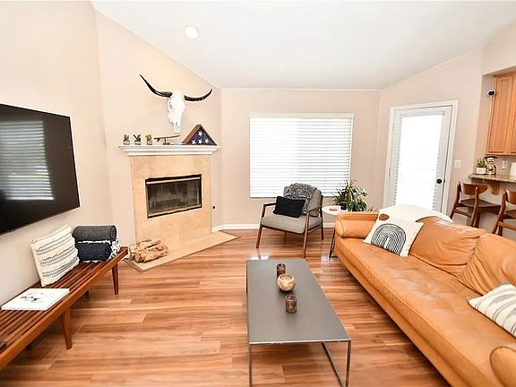 Step into the sunlit living room featuring vaulted ceilings and a cozy gas and wood-burning fireplace. Enjoy direct access to a private balcony perfect for sipping your morning coffee or unwinding in the evening. The adjacent kitchen is well-appointed with granite countertops, stainless steel appliances, a convenient breakfast bar, and ample cabinet space. The spacious primary suite includes a large walk-in closet and a private bathroom. Two additional bedrooms and a full bathroom are located on the lower level ideal for guests, a home office, or a growing family.