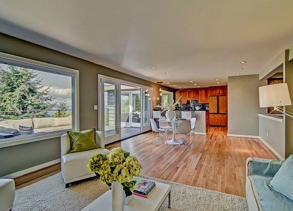 A place of quiet with immense views of Sound, Olympics, Eagles in flight and the approaching weather. Alluring mid-century gem on a secret lane atop Genesee Hill offers beautiful expanses of hardwoods, completely updated systems, open floor plan with contemporary lighting, kitchen with granite,gas range, cherry cabinets, and walls of windows on the view. 2 bedrooms and stone/tile bath on the main, a luxurious view master suite plus den down the wide stair. Expansive decks for outdoor pleasures.