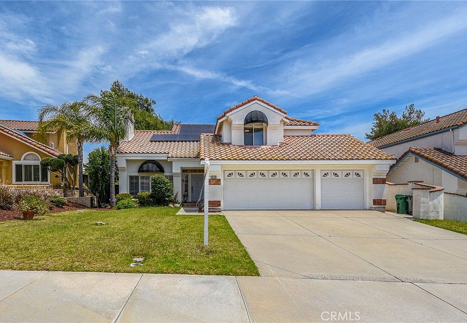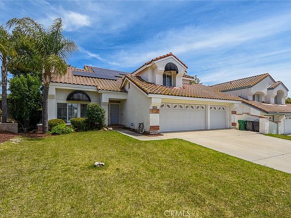 This is an exceptional find located in Murrieta, welcome to this stunning 4-bedroom, 3-bathroom home. As you enter the home you are greeted with wide open floor plan and high ceilings, laminate flooring and carpet. The living room and dining room offer large picture windows which bring in a lot of natural light. There is also a gas fireplace for that touch of warmth and elegance. The chef's kitchen is a true highlight with new laminate flooring, quartz counter tops and matching stainless steel appliances. There is a large center island, gas burner cooktop, oven and microwave and plenty of cabinet space for all of your culinary needs. The kitchen flows into the cozy family room with eating area and the second gas fireplace creating an intimate space for meals. This home also features a bedroom downstairs and full bath, in addition to a separate laundry room with ample storage space and room for your organizational needs. Upstairs you will find the primary bedroom and bath is tucked away on one side of the home for maximum peace and quiet. The en-suite bathroom has been remodeled with large bathtub and separate shower. The doors open up to a private balcony right off your primary bedroom where you can take in the panoramic views. Down the hall holds two additional bedrooms with a shared jack and Jill full bathroom. The view from backyard is stunning with a view of the canyons. In addition, this home has leased solar with very low payments per month. The home is located within short driving to Temecula wine country and easy access to the 15 and 215 Freeways. Don't miss seeing this home