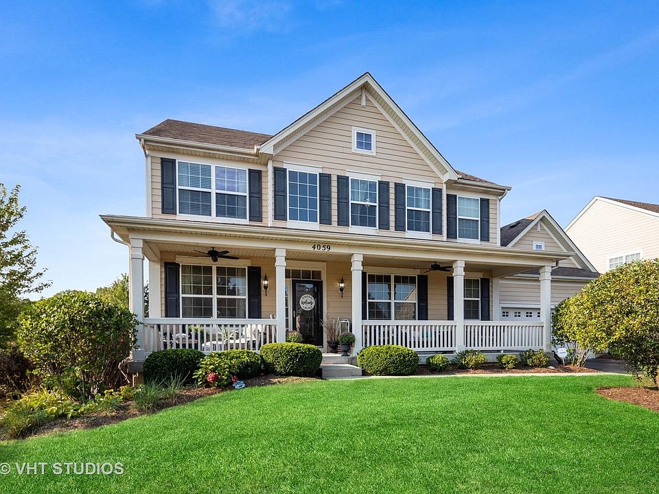 This home has it all! You'll love walking up to the charming large front porch with ceiling fans to sit and relax. As you enter you'll see a 2 story entry and a first floor office with a barn door for privacy. The kitchen is beautifully updated with white cabinets, a farmhouse sink, Corian counters, gray tile backsplash, a walk-in pantry and stainless steel appliances. The kitchen opens to the family room with a beautiful fireplace. The sliding glass door leads to the backyard with a wrought iron fence and incredible pond views. The second story has 4 bedrooms plus a large sun drenched loft.The master bedroom features a vaulted ceiling and a master bath with double sinks, soaker tub, separate shower and an awesome walk~in closet with dressing area. The English basement is an extra deep pour giving you super high ceilings. The garage is huge approximately 32"x22" or 700 sq ft. ~2020 NEW wrought iron fence, porch ceilings fans, bedroom ceiling fans. ~2019 All Corian counter tops, subway tile backsplash, stainless steel kitchen appliances, ring doorbell, Ecobee thermostat, light fixtures in kitchen, hall & dinning room. ~2016 Hot water heater. All this in the Burlington School District ~Country charm yet minutes to parks, restaurants and shopping. Take a look ~ You'll love it!