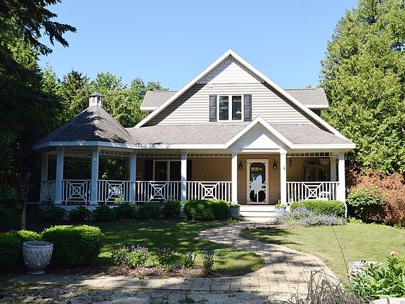 Situated on a deep wooded lot on the shores of Rileys Bay with westward orientation and fabulous sunsets. The shoreline is a combination of small stones and sand adjoining a large brick patio area. The home exudes beachfront character with wrap-around porch and gazebo area providing an extension of the living space. Two car garage with air conditioned bonus movie room above. Floor to ceiling stone fireplace and floor to ceiling windows in the great room with open concept living. Near Potawatomi State Park and at the gateway to all Door County activities.