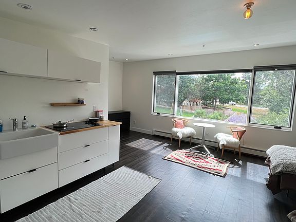 Available December 1st Architect-designed studio apartment (built in 2017) offering a serene living experience above a detached garage. Private and secluded setting, tucked off the alley in a quiet natural environment. Space has abundant natural light and a large picture window, south facing, framing surrounding mountain openspace.