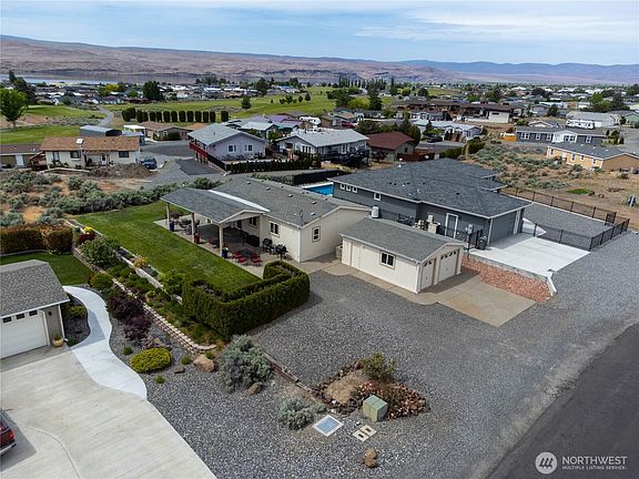 Take in stunning views of the Golf course and Columbia River from this charming 3-bed, 2-bath home in the highly desirable Desert Aire community. This well-maintained home offers 1,188 sq ft of single-level comfort with detached 1-car + golf cart garage, full RV hookups, vaulted ceilings, & large covered patio that's perfect for entertaining! The interior features a spacious layout, large picturesque windows to bring in the landscape, kitchen with peninsula seating, dining space, & double sinks. Plus a primary suite with attached private bath! Set on a great sized lot with a sprinkler system, this property includes access to top-tier amenities: airfield, golf course, boat launch, clubhouse, parks, trails, & more! Low monthly HOA dues, too!