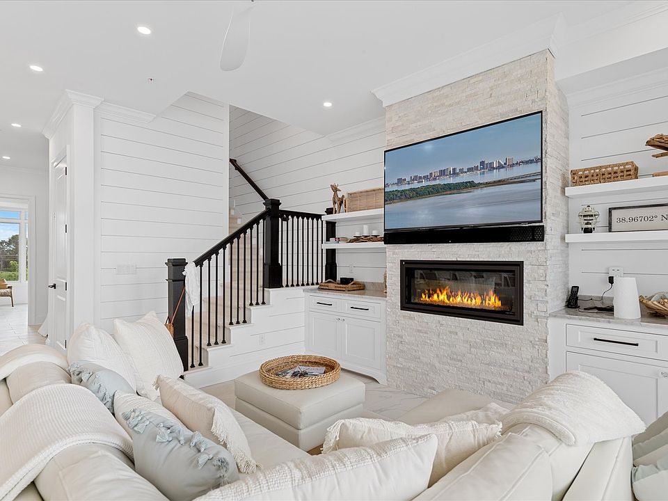 From the moment you step inside, the home exudes craftsmanship and coastal elegance with extensive shiplap and v-joint pine, porcelain Carrara marble, and antique hardwood flooring throughout. Three fireplaces offer warmth and ambiance across multiple living areas.