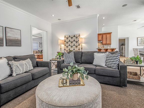 Step into this inviting custom home in Spring Meadows. You’re welcomed by an open living area with a beautiful fireplace, creating an immediate sense of comfort. The space flows into the breakfast room and kitchen, where rich cabinetry and stainless steel appliances form a warm, functional hub. Just off the kitchen, a versatile second living area—also suitable as a formal dining room—features hardwood floors and crown molding, offering flexibility for hosting or relaxing. The breakfast room provides a relaxed spot for casual meals or morning coffee. The master suite offers privacy with a tray ceiling and spa-like bath featuring dual vanities, a soaking tub, and a shower. This split-bedroom layout includes three spacious guest rooms and an oversized Jack-and-Jill bath. Outside, a covered patio and large entertainment area overlook a huge backyard, ideal for play or gatherings. This home blends comfort, convenience, and thoughtful design.