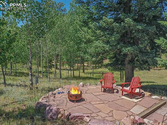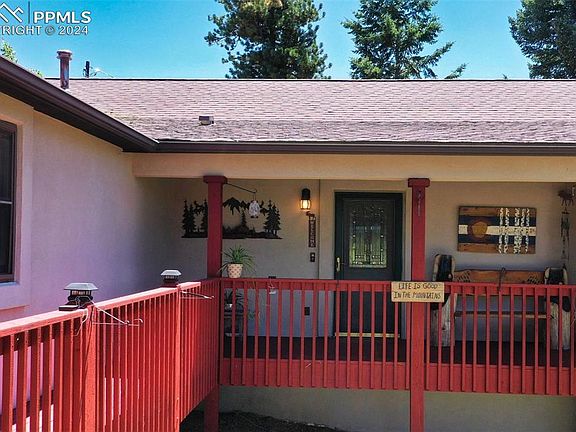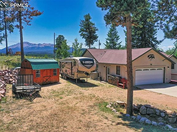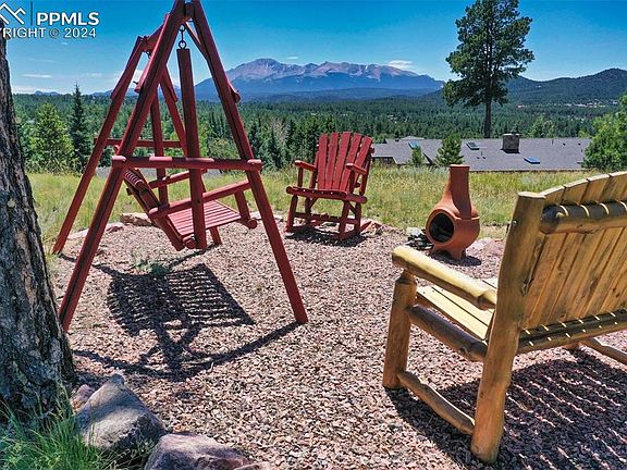 A fully private lot located off the beaten path, overlooking views of Pikes Peak! Main level stucco home on an oversized 1.33 acre parcel zoned A-1 for horses, & w/in the County not city. Home is situated atop a hill to capture the spectacular views of Pikes Peak & the Western sunsets! Expansive patios at the back of the home, & a nice seating area atop the hill for extra views of Pikes Peak. Nicely treed w/ a variety of spruce, aspens and pines, extra RV parking & turnaround in addition to a storage shed. This home features main level living w/ a great room design, & fully finished lower level. Covered front porch leading to the front entryway, greeted by slate flooring, and main level wide planked wood flooring. An open great room w/ vaulted ceilings which features the large living room w/ adjacent dining room overlooking Pikes Peak and centered around a free-standing wood-burning stove. Walkout french door from the dining area leads to a flagstone patio in the rear of the home & the same spectacular views of Pikes Peak! The kitchen & counter-bar are situated to make for easy entertaining, & includes all black appliances, additional cabinetry hutch is built-in for extra storage. The owners suite has vaulted ceilings, & is situated on one wing of the home, w/ views of Pikes Peak, attached 5 piece master bath w/ a corner jetted tub, oversized walk-in shower, as well as a walk-in closet. Laundry hookups are located off the mud room & garage. 2 additional bedrooms are located on the opposite side of the home, each having access to a full bathroom w/ a double vanity. LL of this home includes a workshop area which could be used as a future kitchenette, an expansive family room, & large 4th bedroom w/ a huge walk-in closet. This level is serviced by a 3/4 bath, in addition to a large storage room area. Main level windows are new Renewal by Anderson, lifetime warranted. Upgrades: Anderson windows main level; new wood floors and carpeting; new interior paint; landscaping.