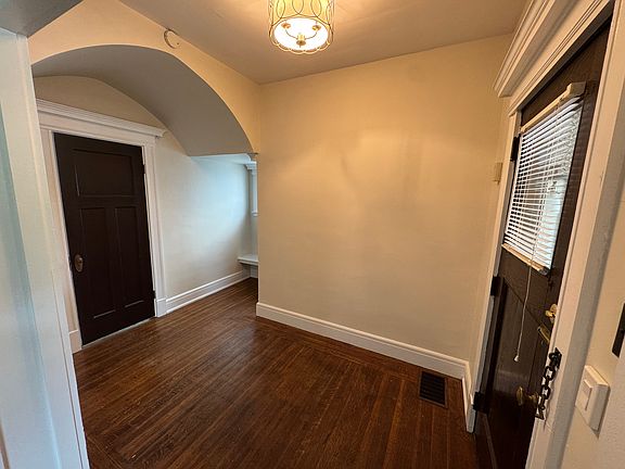 Inside you'll find original woodwork, leaded-glass windows, an original decorative fireplace and mantle, well-kept hardwood floors with inlaid details, pocket doors and tall beamed ceilings. A large foyer works well as a home office/work space. The kitchen includes a gas stove and refrigerator, and the ceramic-tile bathroom has been fully updated. Additional features include a covered front porch, shared laundry and storage spaces in basement, and an off-street parking space for one car.