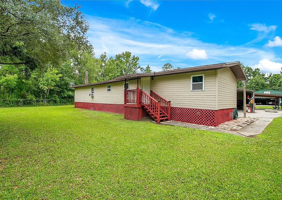 Welcome to your private oasis just 6 minutes from the vibrant heart of town! Nestled on a sprawling 1.6-acre lot and surrounded by mature trees, this property offers the perfect blend of country tranquility and convenient access to modern amenities. The charming 2-bedroom, 2-bath mobile home serves as the main residence, featuring an inviting open floor plan and plenty of natural light. Privacy is paramount here, with the surrounding trees providing a natural barrier from the outside world. The property boasts multiple outbuildings, including a spacious 2-car detached garage with a covered RV space. This RV area is equipped with direct hookups to the septic tank, water supply, and electricity, making it ideal for RV enthusiasts. Additionally, there's a converted barn, perfect for an additional living space, guest house, or even a home office. Enjoy the freedom of no HOA or CDD fees, and take advantage of the property’s agricultural zoning, which allows for a variety of uses. Outdoor living is a dream, with an expansive patio area perfect for entertaining or simply enjoying the serene surroundings. The property also includes a convenient carport, offering additional covered parking. With ample space for gardening, pets, or future expansion, this property is a rare find. Experience the best of both worlds—peaceful, private country living just moments away from the hustle and bustle of town. Don’t miss your chance to own this unique slice of paradise! This home is a CASH only deal that is being sold As-Is.