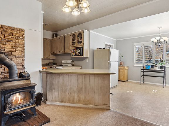 This solid brick home sits proudly on a corner lot shaded by mature trees and features a welcoming wrap-around covered patio. Inside, the layout flows comfortably with inviting living spaces, including a kitchen, living room, and laundry area. A cozy bonus room off the back opens to the backyard deck-an ideal spot to unwind or entertain. Upstairs, you'll find an additional bedroom that can easily serve as an office, hobby room, or extra storage space. The basement provides plenty of room for storage, while a wood-burning stove adds warmth and charm during cooler months. Outside, a lean-to shed offers extra storage, and a carport with a mudroom-style entrance adds convenience. With its sturdy construction, thoughtful layout, and timeless character, this home has great bones and endless potential to make it your own.