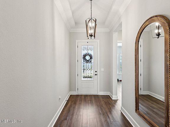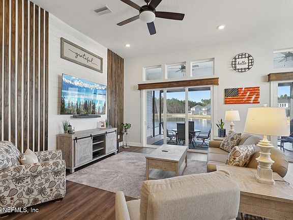 Why wait to build? This better-than-new home has some custom touches and is move in ready with upgraded fixtures, fans and remote control window treatments throughout, a custom wood wall, and added screened lanai. The 12 foot ceilings accentuate the open floor plan and spacious feel in the main living areas. The kitchen is well-planned with many cabinets and an oversized island overlooking the living and dining rooms. The custom tile on the back wall and up to the stainless steel hood is a striking feature that perfectly complements the two tone cabinets. Easy care and durable vinyl wood flooring is seamlessly laid throughout the entire home except for two bedrooms (Primary and one guest room). The flex space is currently used as an office, but can be designed to fit your family - homework room, craft space, den, game room - you decide! It could even be converted to a 4th bedroom if needed. The custom wood wall in the living room creates a focal point and perfectly frames a space for your TV or art. A sure favorite spot will be the large screened lanai designed to enjoy the beautiful pond view out back with birds that visit often and the sun as it sets. Primary retreat with generously sized bedroom and windows to appreciate the same pond view, and a light and bright ensuite bathroom. Not only is the interior of the home equipped with great storage, but the garage is a tandem 3 car garage with extra space to either park another car, or use for storing. All of this in the growing gated community of Middlebourne, featuring a dog park, kids playground, and a resort style pool that will be open this Spring! Close to A rated schools, and all that St. Johns has to offer - shops, restaurants and more. Minutes from the closest interstate so you can get to anywhere you need to be with convenience. Schedule your showing today!