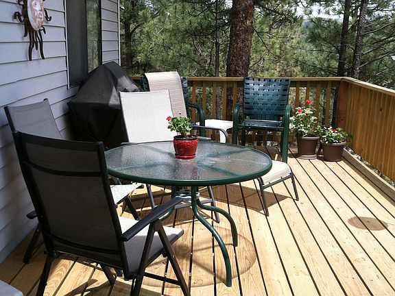 This level entry mountain get-a-way has 4 bdrms and 3 baths conveniently located in a great wooded neighborhood in the heart of Ruidoso. Inside you'll find the cabin partially furnished, with newer appliances, a large vaulted ceiling and a wood burning fireplace with an ample supply of firewood. The 2 bedrooms upstairs have their own bathrooms while the 2 bedrooms downstairs share a full bath. Outside you'll find 3 decks, a fenced dog run and a darling playground in a parklike setting. In the summer relax on the newly updated covered decks with valley views and enjoy your fireplace and den/bonus room in the winter months while sipping your favorite warm beverage. Full bars phone reception, 3 miles from Midtown, blocks from Cedar Creek trails, 1 mile from public golf course - Welcome Home!