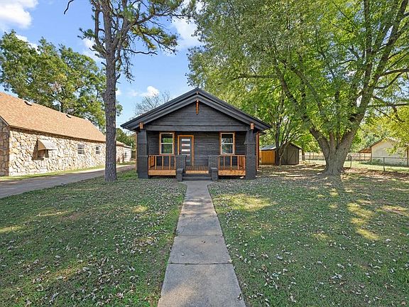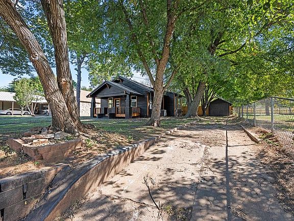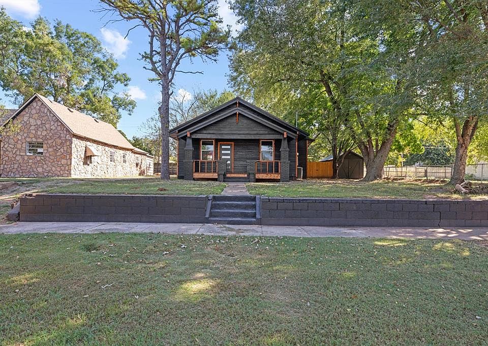 Bright modern feelFully fenced yardCharming front porchOpen-concept layoutSpacious primary bathroomDouble vanitiesMature hardwood trees