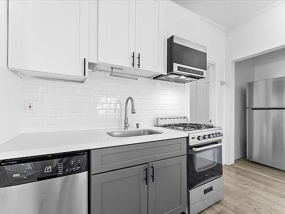 Renovated one-bedroom apartmentNew bathroomsAll-new kitchensStainless-steel appliancesStone countersSpanish inspired buildingWood-inspired flooring