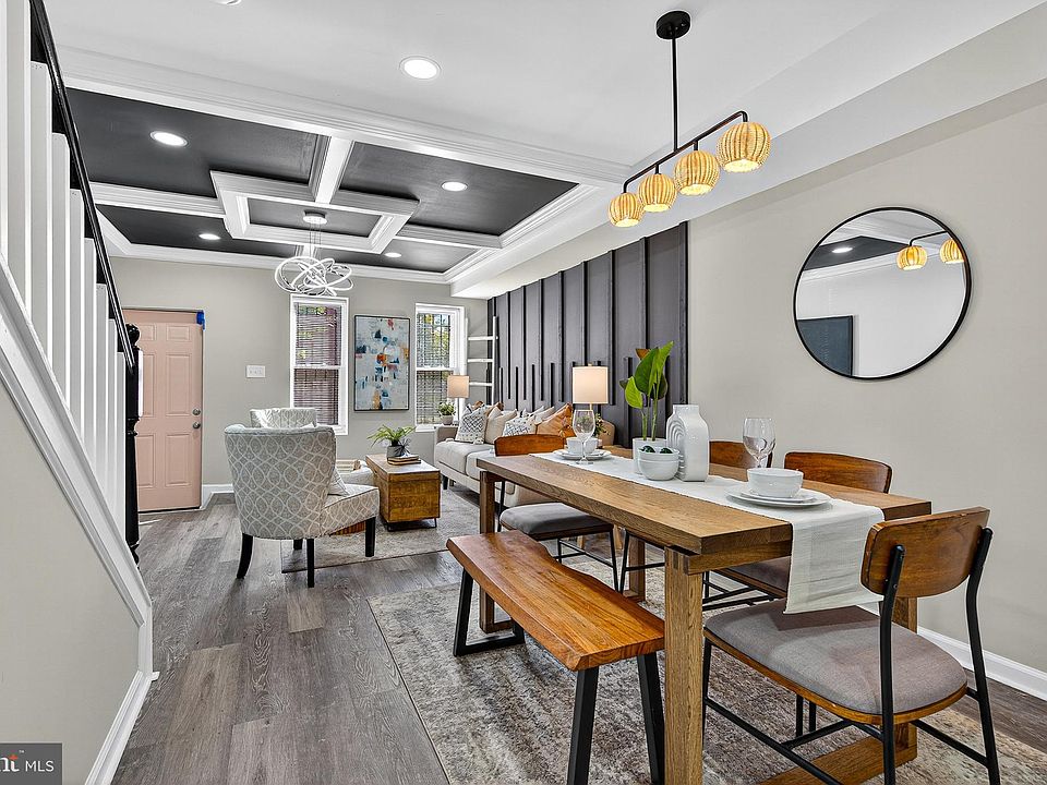 Stunning 5BD/3.5BA Townhouse with Modern Finishes and Dedicated Office Step inside this fully and meticulously renovated townhouse, a masterpiece of modern design and unparalleled function. Offering a generous 5 bedrooms and 3.5 bathrooms, this home provides the space, style, and high-end features discerning buyers are searching for. The open-concept main floor immediately impresses with designer details. The living room features a striking, custom coffered ceiling with an ultra-modern chandelier and a dramatic floor-to-ceiling accent wall, setting a sophisticated tone. Durable, stylish luxury vinyl plank (LVP) flooring flows throughout the main level. The heart of the home boasts white shaker cabinetry, elegant quartz countertops, a subway tile backsplash, and a suite of new stainless steel appliances. An oversized peninsula with bar seating creates the perfect space for casual dining and entertaining. A dedicated dining space is ideal for hosting, complete with a contemporary rattan-style chandelier. A stylish half-bathroom with modern fixtures is conveniently located on the main floor. The second level is home to comfortable bedrooms and a crucial modern necessity. Enjoy the flexibility of a separate room, perfect for a quiet home office, creative studio, or learning area. The full bathrooms are spa-like retreats. One features chic black hardware, marble-look tile, and a walk-in shower with a mosaic pebble floor. The other boasts trendy gold-toned fixtures and a stunning, custom-tiled shower/tub surround with a sleek honeycomb accent. The fully finished basement adds significant living space and utility, featuring the same beautiful LVP flooring and recessed lighting. It includes additional living or bedroom space, a full bathroom, a dedicated laundry area with a washer and dryer hookup, and plenty of storage. Enjoy a private, fenced-in backyard/patio space—perfect for outdoor dining, grilling, or creating a cozy urban oasis. The home is ideally situated with easy access to neighborhood amenities, shopping, and commuter routes. This is more than a home; it's a completely updated lifestyle opportunity. Don't miss your chance to own this turn-key, designer-inspired property!
