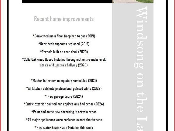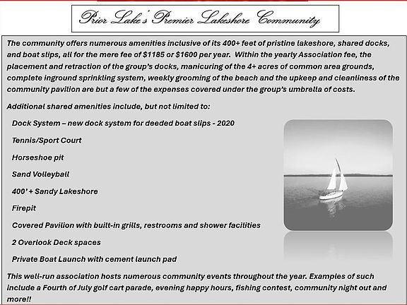 Most demanded neighborhood on the lake. Windsong on the Lake is a Premiere, shared, lakeshore community of Prior Lake. Over 400' of sandy shoreline. This astounding 2 story is situated on a private, cul-de-sac, 1.14-acre lot. Don't miss this hard-to-find, home with amazing features and several recent updates. This stunning property provides a 1-minute walk to your boat slip and all the lake amenities. Incredible lake living ideal for today's busy lifestyle. This home is a true 10+. The community has 36 homes & has a yearly association fee of 'only' $1185 fee. Common amenities include over 4 acres of common grounds, 2 picnic - overlook decks, Tennis/sports court, Horseshoe pit, Sand volleyball court, Covered Pavilion complete with restroom and showering facilities, fire pit area, picnic tables, grills and association private launch. The sandy beach that gets groomed throughout the season for a manicured look and feel. The homeowner's deed is inclusive of a personal, private, boat slip. Lakeshore living without the individual lakeshore taxes!! Experience incredible lightshow of the 4th's fireworks from the comfort of your own beach. This beautiful home has a gracious foundation providing for large living spaces and 4 bedrooms on one level. Embrace the lifestyle at an affordable price, thoughtful updates, and plentiful living spaces - all strategically placed on this expansive lot. Welcome home to 4060 Eau Claire Circle NE