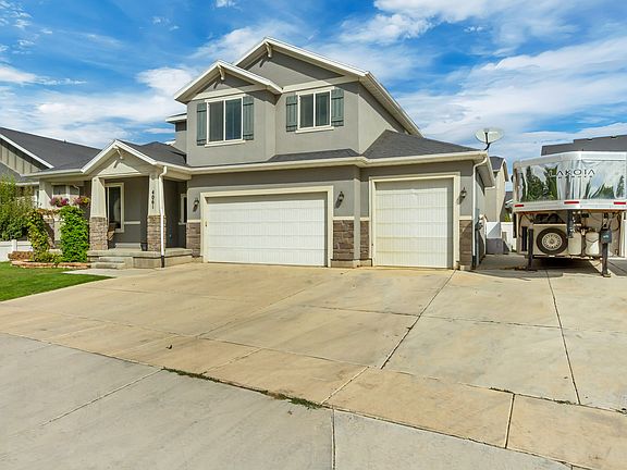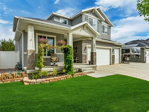 ***10K Price Drop! Located in the Porters Crossing neighborhood of Eagle Mountain, this 3,556 sq. ft. two-story home on .15 acres combines modern design with practical comfort. A welcoming covered porch sets the tone at the front, paired with a three-car garage and RV parking that provide both convenience and storage. Inside, the main floor opens to an airy living area filled with natural light, connecting seamlessly with the kitchen and dining spaces to create a central hub for everyday living and gatherings alike. The home offers six bedrooms and three and a half baths, with four bedrooms upstairs and two in the finished basement, giving flexibility for family, guests, or private office space while maintaining a sense of openness throughout. The master suite stands out with its beautifully updated bath featuring a garden-style tub, blending relaxation with a touch of elegance. Out back, the fully fenced yard includes a deck, shaded seating, and garden space, offering both privacy and room to enjoy the outdoors. Beyond the home itself, the location is ideal-close to top-rated schools and brand new shopping areas, with Mountain Ranch Bike Park nearby and Five Mile Pass just a short drive for hiking and off-roading. Community parks, trails, and sports programs throughout Eagle Mountain make it easy to enjoy an active lifestyle. Solar power further adds efficiency without taking away from the home's clean, modern style, making this property both practical and welcoming in one of Eagle Mountain's most established neighborhoods. All information provided is deemed reliable but is not guaranteed and should be independently verified by buyer and buyer's agent. Important Note: Solar panels have been professionally installed, and the cost of the system is covered by the seller. The buyer will be responsible for arranging final connection of the panels to the home's power through a solar company.