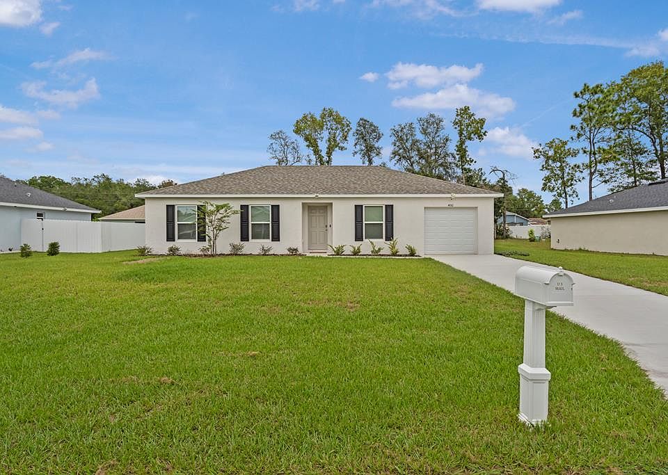 MOTIVATED SELLER!!!!!! 3bds 2ba with 1,243 sq ft move in ready home! Live where others vacation! Better than new, warrantied home in the heart of Florida horse country! Welcome to 4061 SW 133rd Ln, a stunning home built in 2025 in the desirable Marion Oaks Community of Ocala Florida, a city nationally recognized for its rolling green pastures, equestrian lifestyle and growing economy! Just minutes from the World Equestrian Center and Silver Springs State Park. This move-in ready home features over 1,200 sq ft of well planned living space with an open concept great room, modern kitchen outfitted with stainless steel appliances, 30 inch upper cabinets, an energy star rated dishwasher, remote lighted ceiling fans throughout and security lighting! Thoughtfully designed with durable vinyl flooring, plush carpets and a private primary suite. This home offers everyday comfort and style! Enjoy the best of Florida living with a 0.23 acre lot and concrete block stucco construction, 1 car garage and no HOA restrictions! Whether you're a first time home buyer, downsizing or investing, this property checks all the boxes!