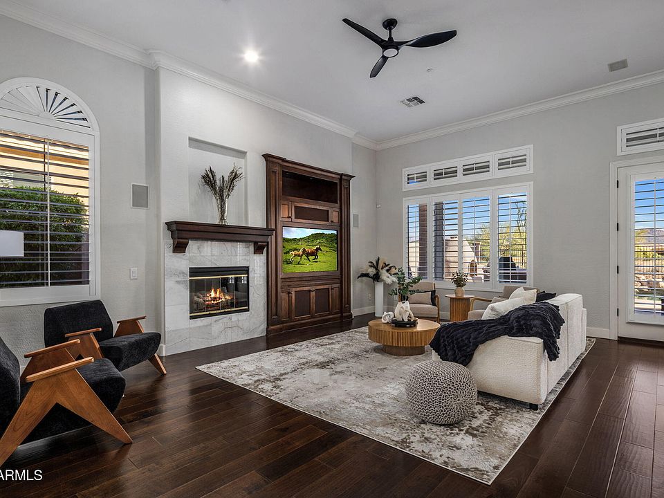 Back and Better Than Ever! This gem is making its encore appearance on the market with a stunning new glow-up! Three full baths/bedrooms, new flooring, lighting, hardware/plumbing! The wow factor just went up! Fantastic remodel! Come check it out! The spacious primary suite features stunning mountain&golf course views. Outside, relax on the oversized covered patio w/pool, built-in BBQ & fireplace. Soft water system & reverse osmosis included. TWO newer HVAC units, newer wood floors, granite countertops, & elegant wood shutters throughout. The open floor plan is enhanced by soaring 12' ceilings throughout. Located in one of the area's most sought-after neighborhoods. Designed for those who appreciate beautiful spaces and easy living; this is tranquility with style! Enjoy your new home
