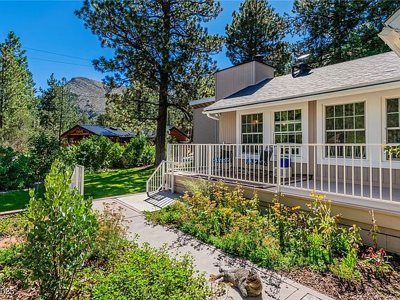 The custom woodwork throughout this home is incredible. Great room w/ vaulted beam ceilings, wood burning fireplace with insert. Beautiful windows in great room that opens from the top or the bottom. Kitchen w/ custom cherry wood cabinets, newer kitchenaid stove, stainless steel refrigerator and dishwasher, beautiful hardwood flooring & breakfast bar w/ storage below. Separate Office/Den or Library with beautiful custom built-in bookcases, cabinets, vaulted ceilings, electric fireplace & hardwood flooring. Bedrooms are separate from each other. Large Covered Front Porch to sit out & enjoy the beautiful Mt views. Side deck that overlooks a park like setting yard with more sitting areas. Separate workshop or storage building. This is a large level lot w/ grass area for summer outdoor playing. 2 separate asphalt driveways that will hold a total of 8 cars. Parking is a premium on the mountain. This home is gorgeous. 20K Generator stays w/home. Brand new roof put on in September.