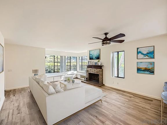 This corner end unit with interior location is a true gem, boasting a rare direct garage entrance and an abundance of southerly windows that fill the space with golden sunshine and refreshing breezes. The cozy brick fireplace with an elegant mantel adds charm and warmth to the living area, complemented by a spacious corner loveseat featuring extra storage. Recent upgrades include stylish ceramic plank flooring and a remodeled kitchen showcasing exclusive Corian countertops. The retextured ceiling enhances the modern feel, while the private interior laundry and walk-in closet with chic organizers offer added convenience. Step outside to your private patio, perfect for relaxing or entertaining. Located in the vibrant UTC/La Jolla area, you’ll be just minutes away from shopping, theaters, restaurants, UCSD, busline, Trader Joe's, Whole Foods, and more. This home combines comfort, style, and an unbeatable location—don’t miss out!