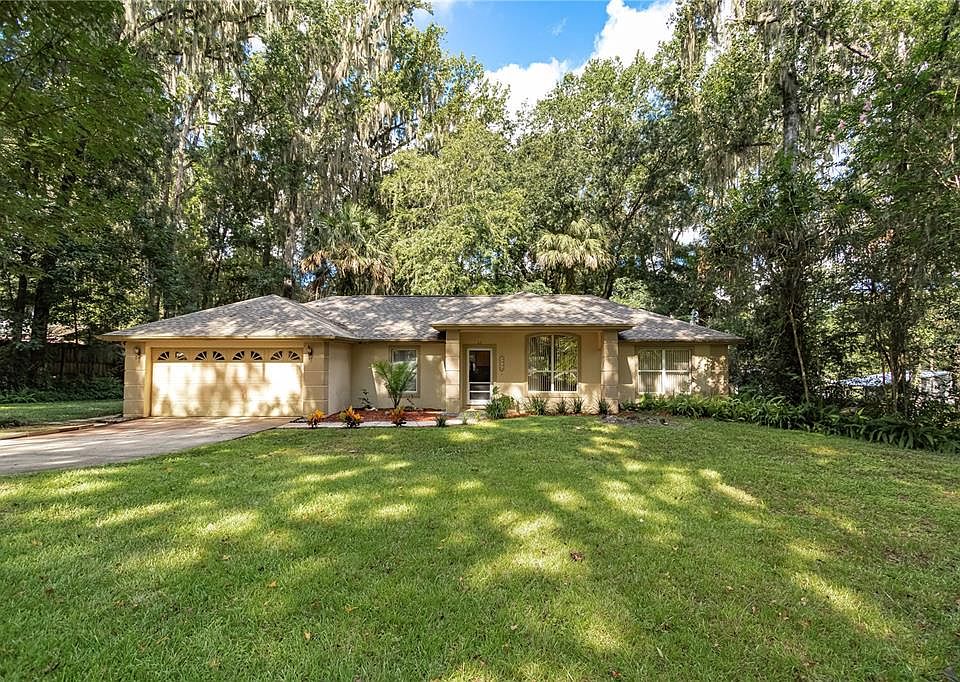 THIS HOME HAS A LOT TO OFFER WITH .50 ACRE LOT, NO HOA, 2020 30 YEAR ARCHITECTURAL ROOF, 2018 HVAC (a/c), 2023 EXTERIOR PAINT, AND 2023 WHOLE HOME LUXURY VINYL PLANK! THIS CONCRETE BLOCK STUCCO HOME HAS A FRONT PORCH LEADING TO OPEN FLOOR PLAN WITH NEW LVP FLOORS WITH SPACIOUS LIVING ROOM WITH VAULTED CEILINGS OVERLOOKS THE KITCHEN, DINING AREA AND DOUBLE SLIDING DOOR, SCREENED IN AND COVERED LANAI/ PATIO. THE KITCHEN HAS PLENTY OF CABINETS FOR STORAGE AND FORMICA COUNTERTOPS, A SKYLIGHT FOR NATURAL LIGHT, AND TILE FLOORS. THE OWNERS BEDROOM IS SPACIOUS AND FEATURES 2 CLOSETS, THE OWNERS BATH HAS DOUBLE VANITIES WITH LOADS OF COUNTER SPACE, NEW COMFORT COMMODE, GLASS DOOR SHOWER EQUIPPED WITH HANDICAP BAR AND TILE FLOORS. ACROSS THE HOME ARE THE 2 ADDITIONAL BEDROOMS, THEY SHARE THE SECOND BATH WITH TILE COMBO TUB/SHOWER. 2 CAR GARAGE IS WHERE THE LAUNDRY AREA IS WITH UTILITY SINK, IN GARAGE IS A SIDE ENTRY DOOR FOR ACCESS, ALSO A PULL DOWN ATTIC. THE BACKYARD IS SPACIOUS AND HAS VERY NICE LUSH TREES AND BUSHES. THERE IS STORAGE SHED HERE AS WELL. NO CARPET!! HOME IS ON WELL AND SEPTIC. NEAR GRAND OAKS SHOPPING CENTER!